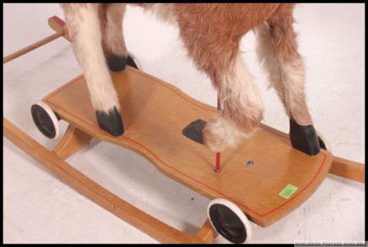 A vintage / retro two in one rocking horse / push along, the body of the horse being covered with real animal hide 85x125x40cm
