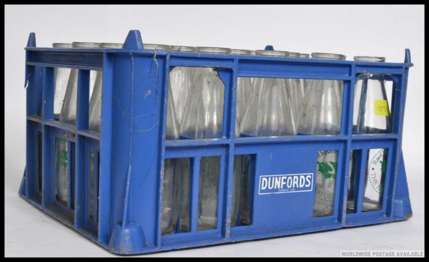A vintage Dairy Industrial advertising milk bottle crate complete with bottles having notation.