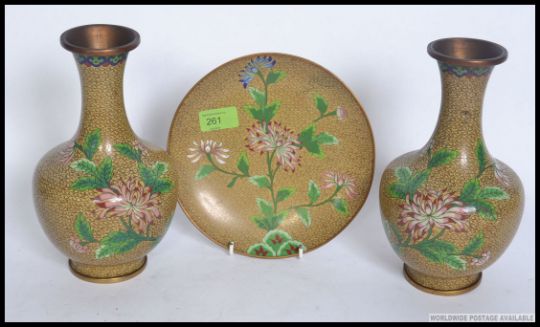 A pair of Chinese cloisonne enamel baluster vases having floral spray decoration along with a matching plate. H24 cm