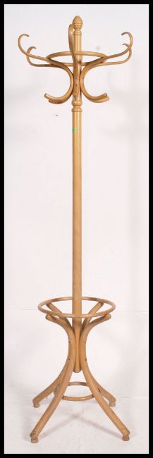 A Thonet style contemporary bentwood hat stand with hooks atop and shaped splayed base legs