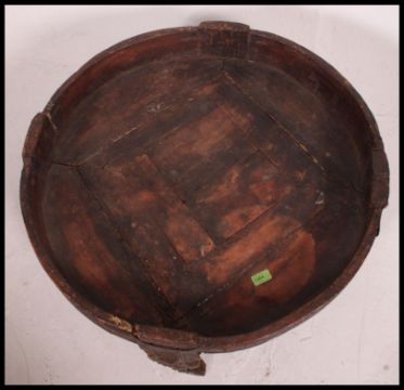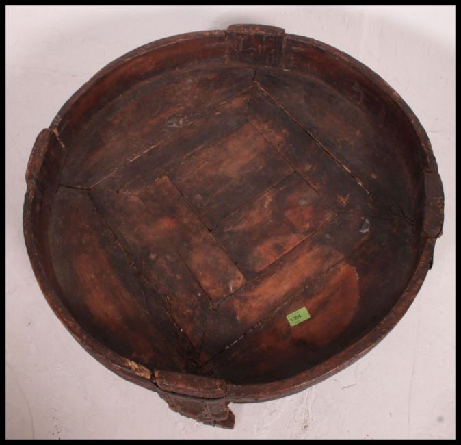 A 20th century Indian cartwheel opium table. Raised on stile legs with scratch carved design.