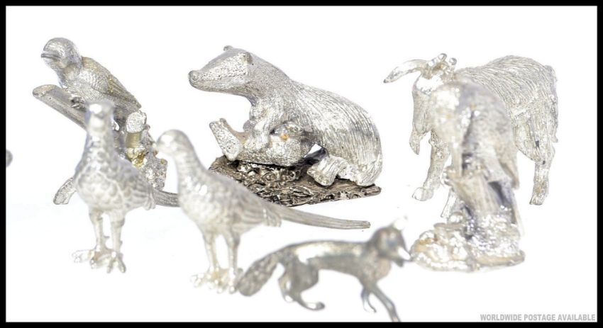A collection of white metal animal ornaments of decorative form being well crafted. To include pheasant, parrot, fox, polar bear and others