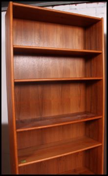 A good quality large pair of retro teak wood upright bookcase cabinets. Each raised on plinth base with central adjustable shelves. Measures: 210 x 89 x 28