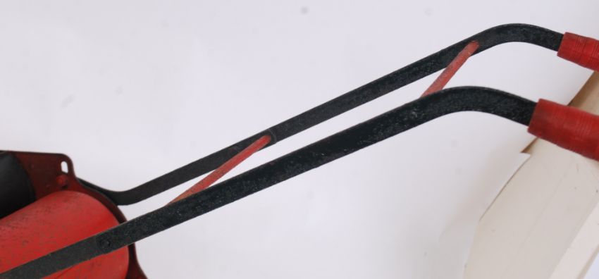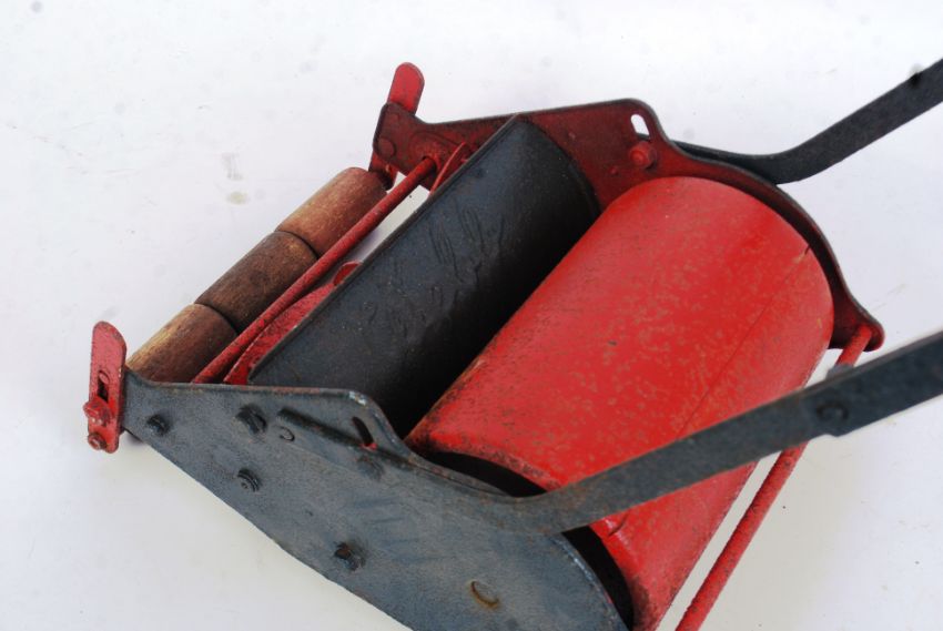 WEBB CHILDS LAWNMOWER: A charming vintage tinplate and metal childs Webb manual lawnmower. In green and red, all original, still retaining the wooden rollers to the front. ' Webb ' in pressed tin to top. Approx 80cm long/tall. WORLDWIDE POSTAGE AVAILABLE ON ALL ITEMS. UK - £15.99+VAT. EUROPE - From £19.99+VAT, AMERICA - From £25.99+VAT. PLEASE CONTACT US FOR A QUOTE OVERSEAS. COMBINED POSTAGE AVAILABLE Viewing welcome by appointment only. See www.eastbristol.co.uk for full rates.