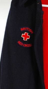 BRITISH RED CROSS CAPE: An original vintage (1940's / 1950's ) British Red Cross Nurse's uniform cape. With embroidered Red Cross emblem to one side and patch to the other.