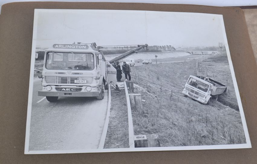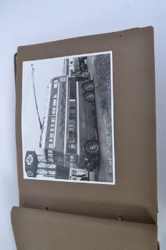 TRANSPORT: A good vintage album of assorted early 20th century photographs of hauliers wagons / vehicles etc. Interesting selection, 45+ images, all laid within a vintage brown AEC Sales book. Most appear to show hauliers in Ireland. Some wonderful images, mostly trucks, buses and trains, to include; London Transport Trolley Bus, Northern Sand & Brick Co, Merville Dairy, Morton Brothers of Belfast, a truck accident. Fascinating. Most images around 5"x7", but some other sizes.