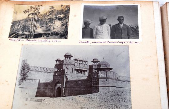 STANSFIELD BROUN PHOTO ALBUM: A fascinating post-WWI 1920's - 1940's photograph album, once the property of G. Stansfield-Broun. Mostly detailing his travels after the war to Africa / West Indies etc, c1920's. Photographs include Bengal Kookee, 'various wrecks of vessels destroyed during the ***** (unreadable), Middle East, Chakrata, Himalayan views, photographs of a small clerk annotated 'absolutely no deformity!', Circus elephant bathing in a river, Ganges, Hardwav, Trail derailment and Pathri, Tibetian cavalry, King Albert of Belgium, Lord Lytton, ' Inspecting the Gurkhas', Rufus Isaacs, a posed photograph at a monastery depicting Tibetan dancers etc. Unique collection.