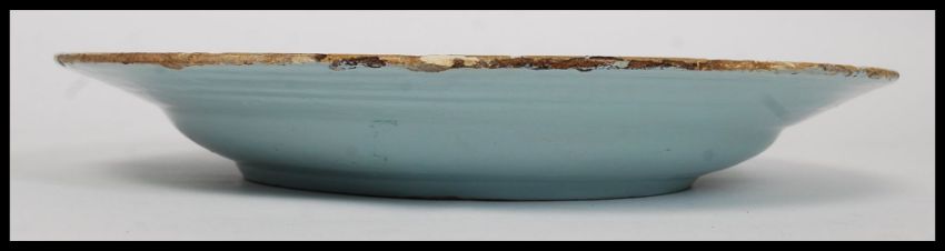 An 18th century blue and white Delft charger - large plate. Decorated with foliage to the borders and country scene set to centre. W35cm