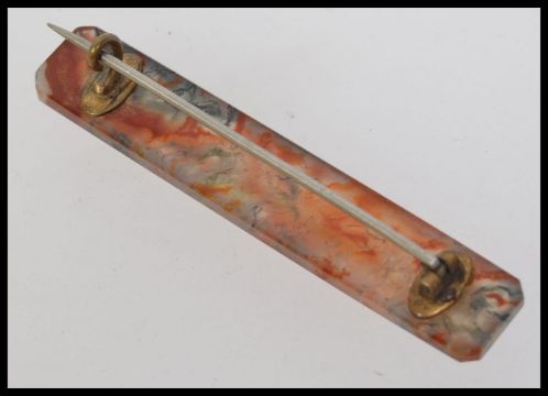 A 1930s Art Deco faceted moss agate bar brooch with c clasp. Weight 12.4g. Measures 7cms