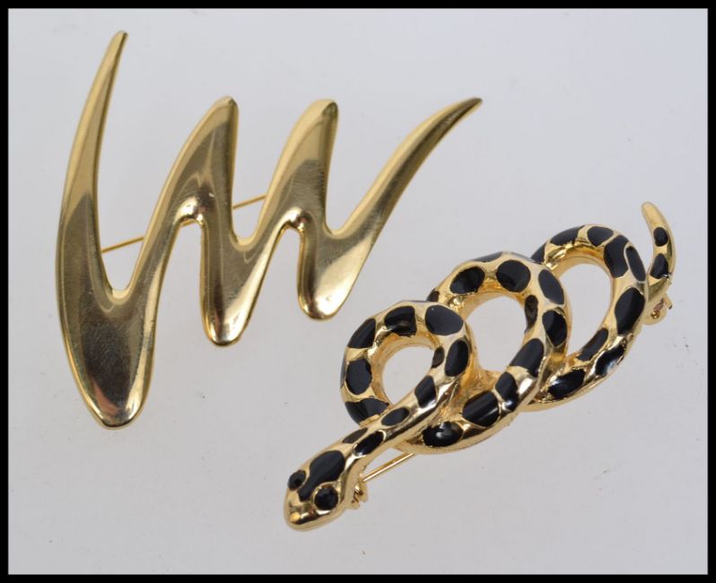 Two large vintage yellow metal brooches One being a coiled snake and the other a lightening bolt. Weight 30g.