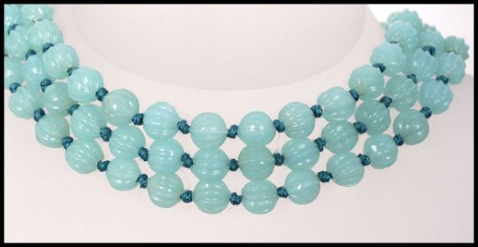 A long string of vintage 1930s Bohemian opaque pale blue fluted glass beads on a green knotted string. Measures 66 inches.