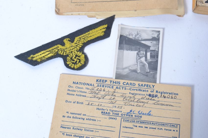 A soldiers release book for Cpl JC Weeks - Tripolitania Signal Squadron - To include a Nazi breast eagle patch, paperwork to include Unit Military Conduct sheet, National Service Acts along with 3 books. Tail Gunner by Rivaz, The Deep End - Battle For Africa and Combined Operations - The Official Story of the Commando's