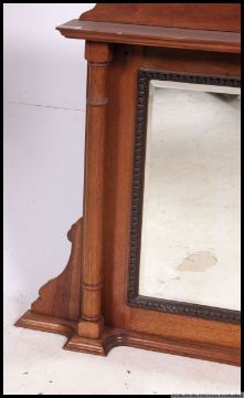 A Victorian mahogany armorial revival overmantel mirror. Raised on plinth base with bevelled plate mirror glass having column sides and flared cornice