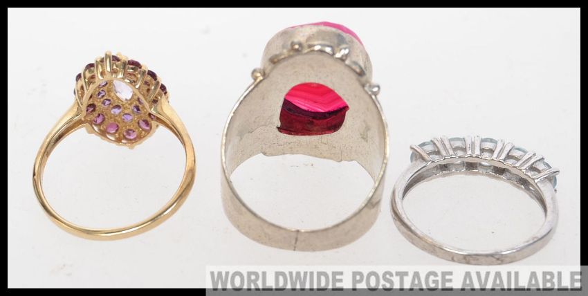 A collection of three silver costume jewellery dress rings to include an oversized cut pink marble effect stone along with two others