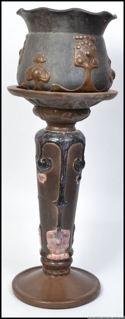 An early 20th century large Art Nouveau ceramic pedestal plant stand by Bretby. Stone glazed with art nouveau embellished design. Stamped to the underside. H81cm
