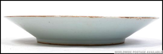 A 1930's Chinese celedon Chinese large charger with twin dragons having green ground and geometric borders. Originally a wedding present from vendors great grandmother. Stamped to verso 'Made in China' W40cm