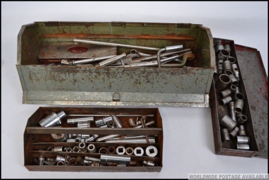 A vintage metal metamorphic tool box complete with a collection of Imperial measure tools to include sockets, spanners etc