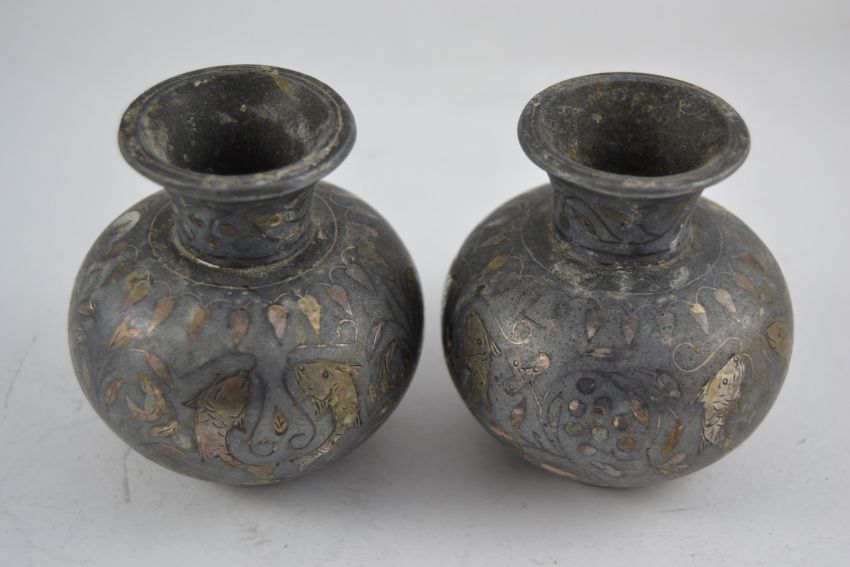 A pair of silver and pewter inlaid asiatic vases of stub form. Beautiful inlaid details with waisted necks H6.5cm