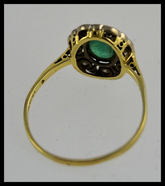 An 18ct gold emerald and diamond ring, the oval cut emerald surrounded by approx 40pnts diamonds. Total weight 3.3g /Size U