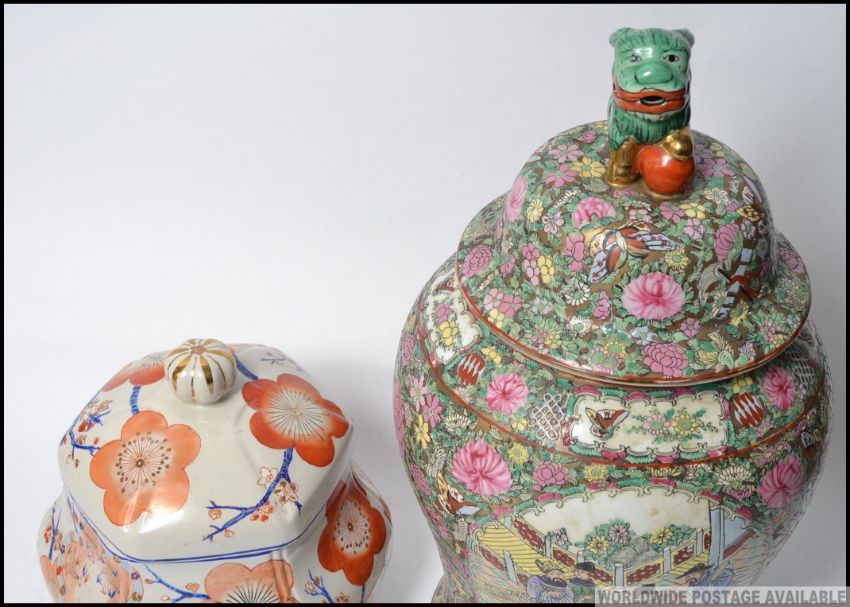 A large Chinese famille rose jar with decorative scenic cartouche panels and foliate design elsewhere. H52cm