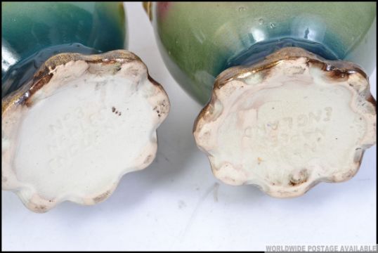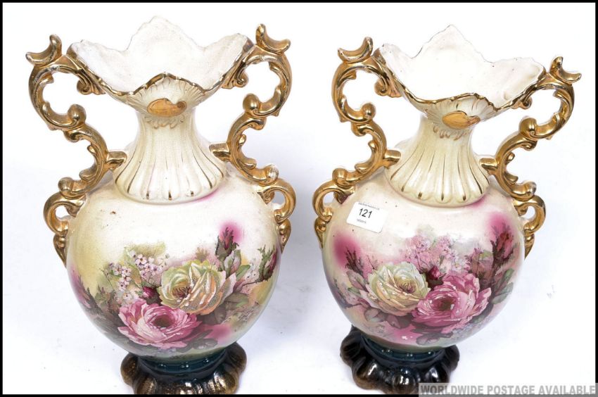 A pair of 19th century pair of Staffordshire floral transfer printed twin gilt handled ewers, stamped to the base No 3 Naples England