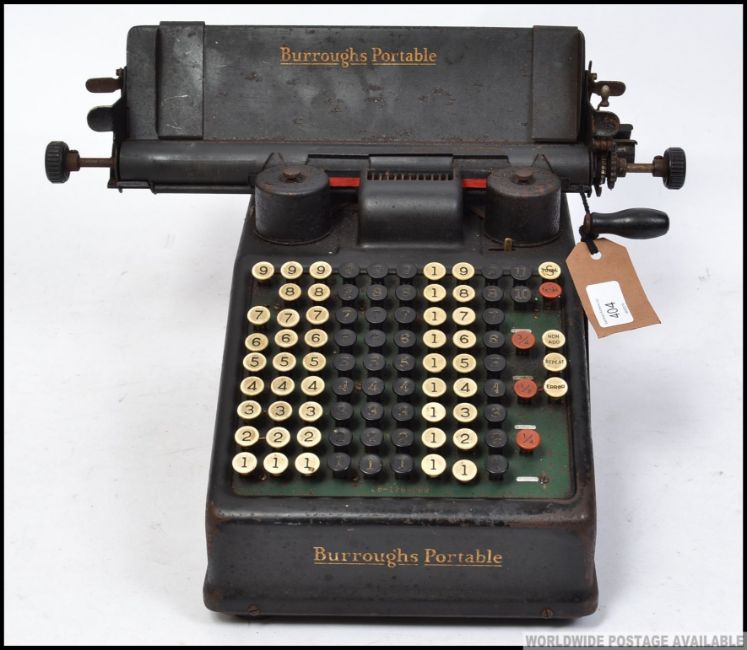A vintage industrial Air Ministry desktop Burroughs Portable adding calculator machine, having applied air ministry plaque c1940's. W44cm