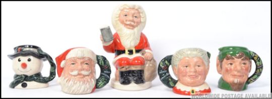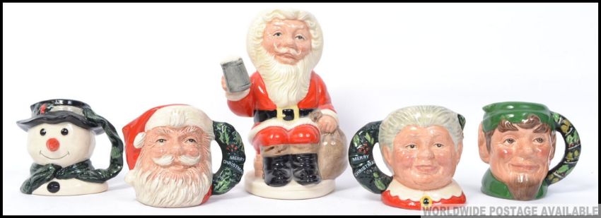 A group of 7 Christmas themed Royal Doulton Character toby jugs to include Snowman D6972 , Mrs Claus D6922 , Santa Claus D6900 , Father Christmas D6940 1304/3500 , Elf 6942 etc. H13cm