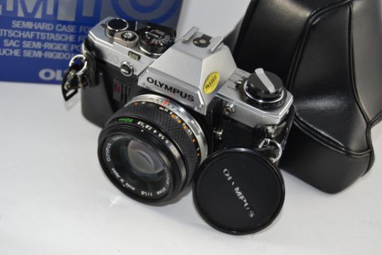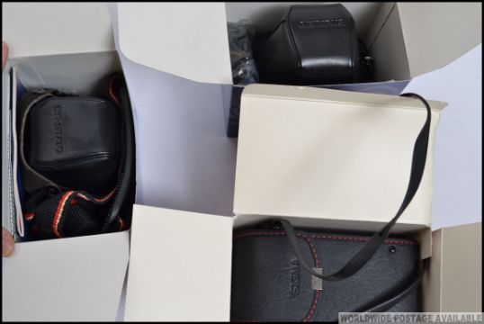 A matching pair of working Olympus OM10 35mm camera bodies, each with an Olympus OM-System Zuiko Auto-S 50mm 1:18 lens still retaining the original boxes, camera cases, carry bags, flash heads and another boxed zoom lens f=80-200mm. W64cm
