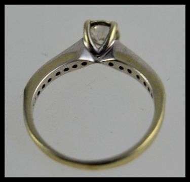 A 9ct white gold ladies diamond ring. Single central round cut stone being claw mounted with channel set diamond shoulders approx 50pnts. Total weight 2.7g / Size N