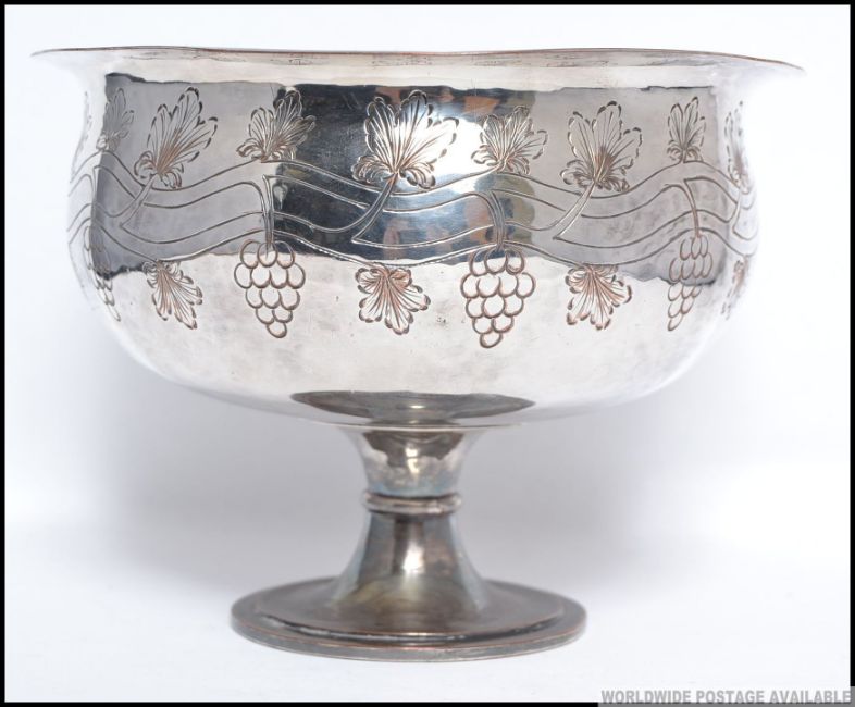 A silver plated on copper pedestal bowl being decorated with grapes and vines in a continuous pattern by the Duchess of Sutherland's cripple guild. Marked with crown and initials to foot. W15cm