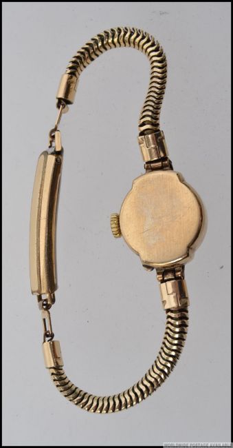 A ladies 9ct / 375 gold vintage Majex 21 jewel Incabloc cocktail dress watch set on snake style bracelet. Total weight 12g