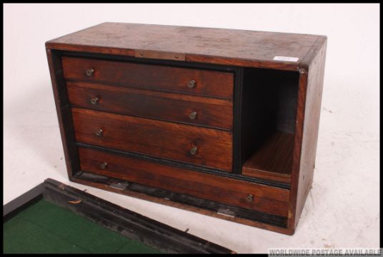 Oak engineers tool box, rectangular form, fall front enclosing drawers with applied brass plaque with notation for DSJ BEER