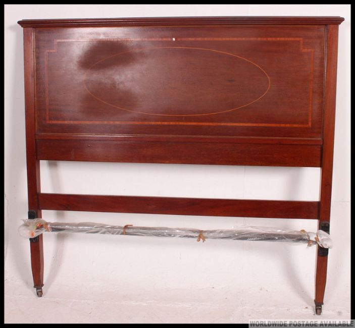 An Edwardian mahogany inlaid bow front double bed complete with the rails ( not showing ) Matching washstand and dressing table in lot 1318 & 1307. H100 x W140cm