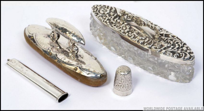 A collection of silver hallmarked items to include a silver thimble by James Fenton with assay marks for Birmingham dated 1891, NAil Buffer Birmingham 1908 by JW Benson, Trinket box Birmingham 1907 by William Davenport and a pencil holder with Chester assay marks
