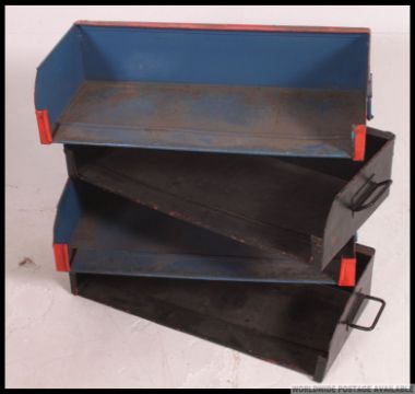 A collection of vintage mid 20th century industrial painted metal Tote trays taken from the ex Douglas motorcycle factory Bristol