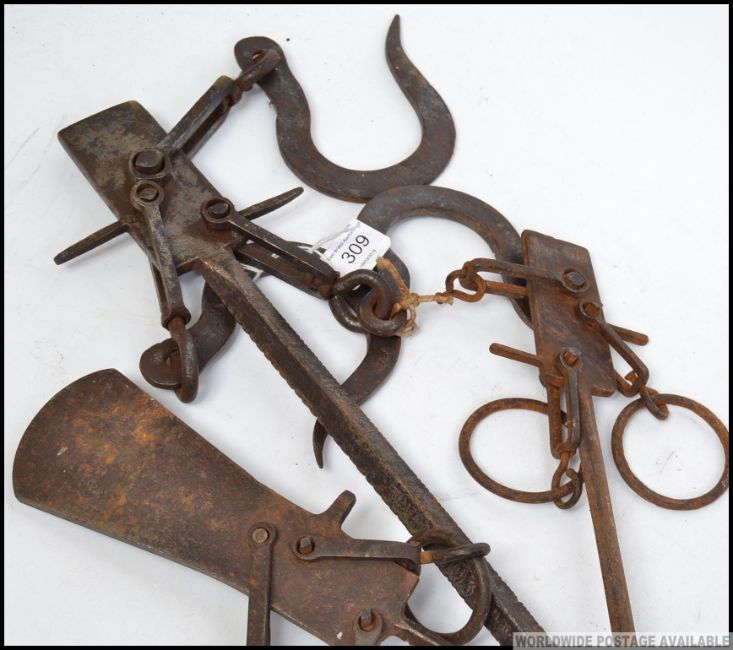 A pair of 19th century fireside potjacks / game scales made of cast iron complete with the ball weights and the hooks