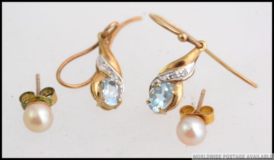 A pair of ladies 9ct gold aquamarine and diamond set earrings. The small 1pnt stones with aquamarine oval cuts beneath. Together with a pair of 9ct gold and pearl stud earrings. Total weight
