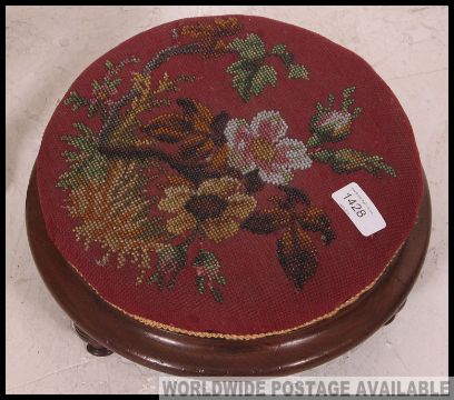 A Victorian mahogany berlin needlepoint circular footstool raised on pad feet together with another having yellow velour upholstered top