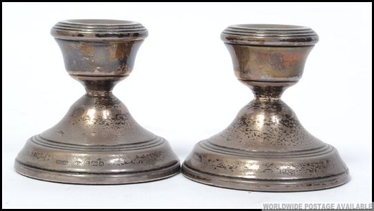 A pair of silver hallmarked candle sticks of miniature form with makers marks for Broadway and CO Birmingham 1976 288g