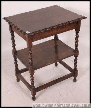 A 1920's carved oak barleytwist side table having scalloped edge table top with secondary tier beneath. H72 x W60 x D45cm
