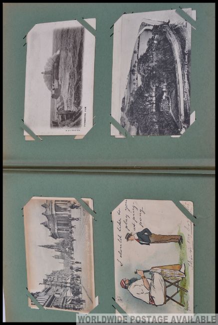 Edwardian slip-in album type with almost 300 circa 1910 picture postcards. Vast selection, many street scenes, wide range of subjects. Super collection.