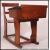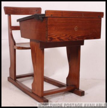 A Victorian oak and elm wood school desk and chair being integrated on sleigh runners, the desk with hinged top. H74 x W89 x D57cm
