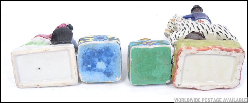A Staffordshire flatback figurine of a zebra and seated gentleman together with a continental figurine diorama and 2 ceramic inkwells. H19cm