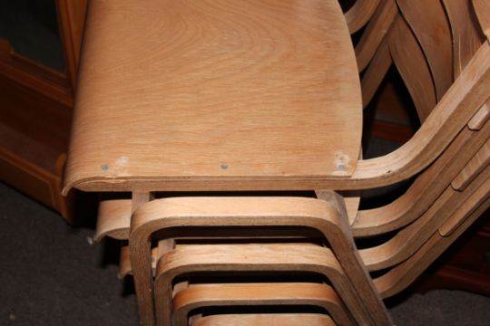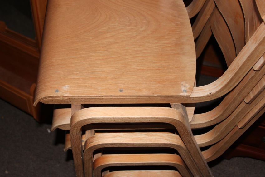 A stack of 4 retro Tecta Industrial stack chairs - dining chairs, each chair with labels to underside