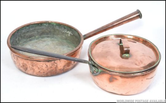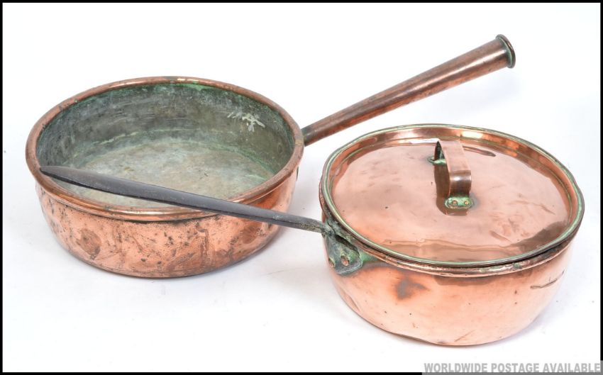 2 Victorian large copper saucepans. Both large with one having tubular tapering handle, the other with cast iron handle complete with lid. W35cm