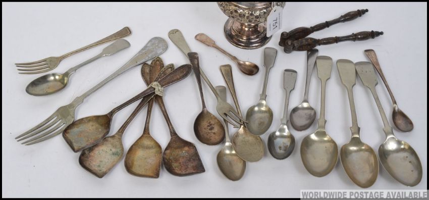 A decorative silver plated sugar shaker in relief along with flatware, some silver hallmarked along with others. H18cm