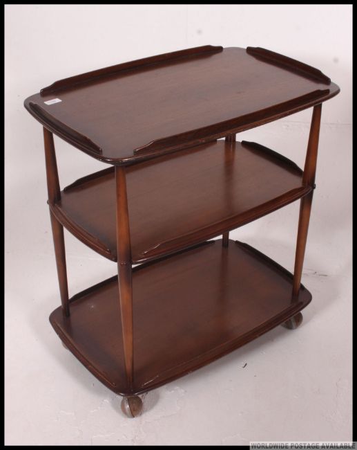 An Ercol Windsor dark elm and beech three tier trolley, on wheels, 72cm wide, 74cm high, 47cm deep. H7 x W72 x D46cm