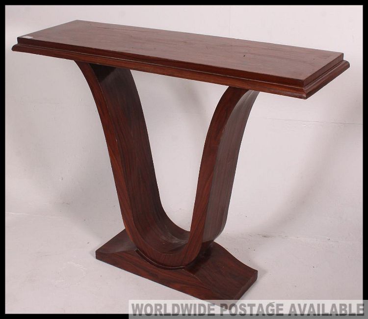 A 1930's Art Deco style console table raised on plinth base with scrolled supports and rectangular top above. H90 x W112 X D37cm