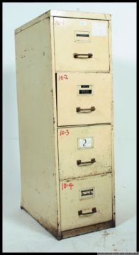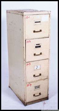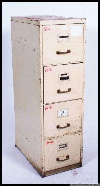 A set of four drawer vintage industrial slim metal filing cabinet, painted white brass handles above notion slides, taken from ex Douglas motorcycle factory Bristol. H131 x W40 x D65cm