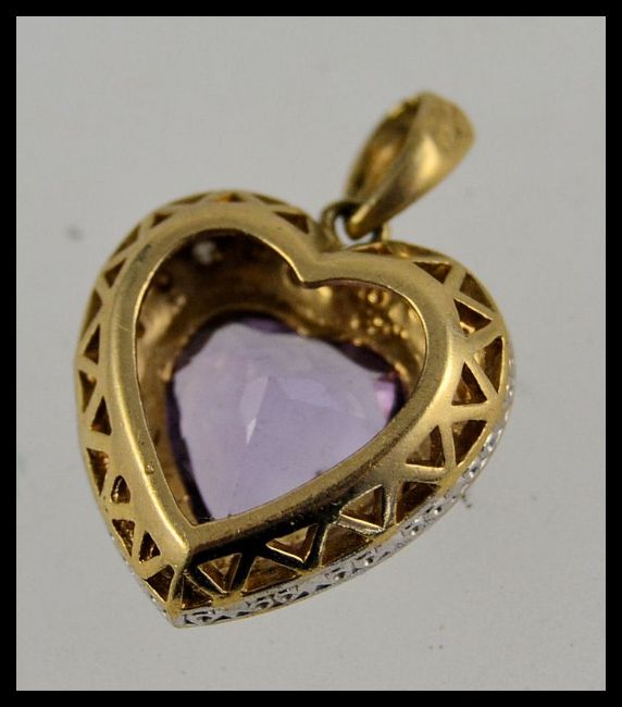 A 9ct gold amethyst and diamond set necklace pendant of heart shaped form. Total weight 3.9g